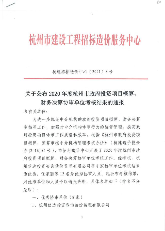 2020年度杭州市政府投资项目概算、财务决算良好协审单位