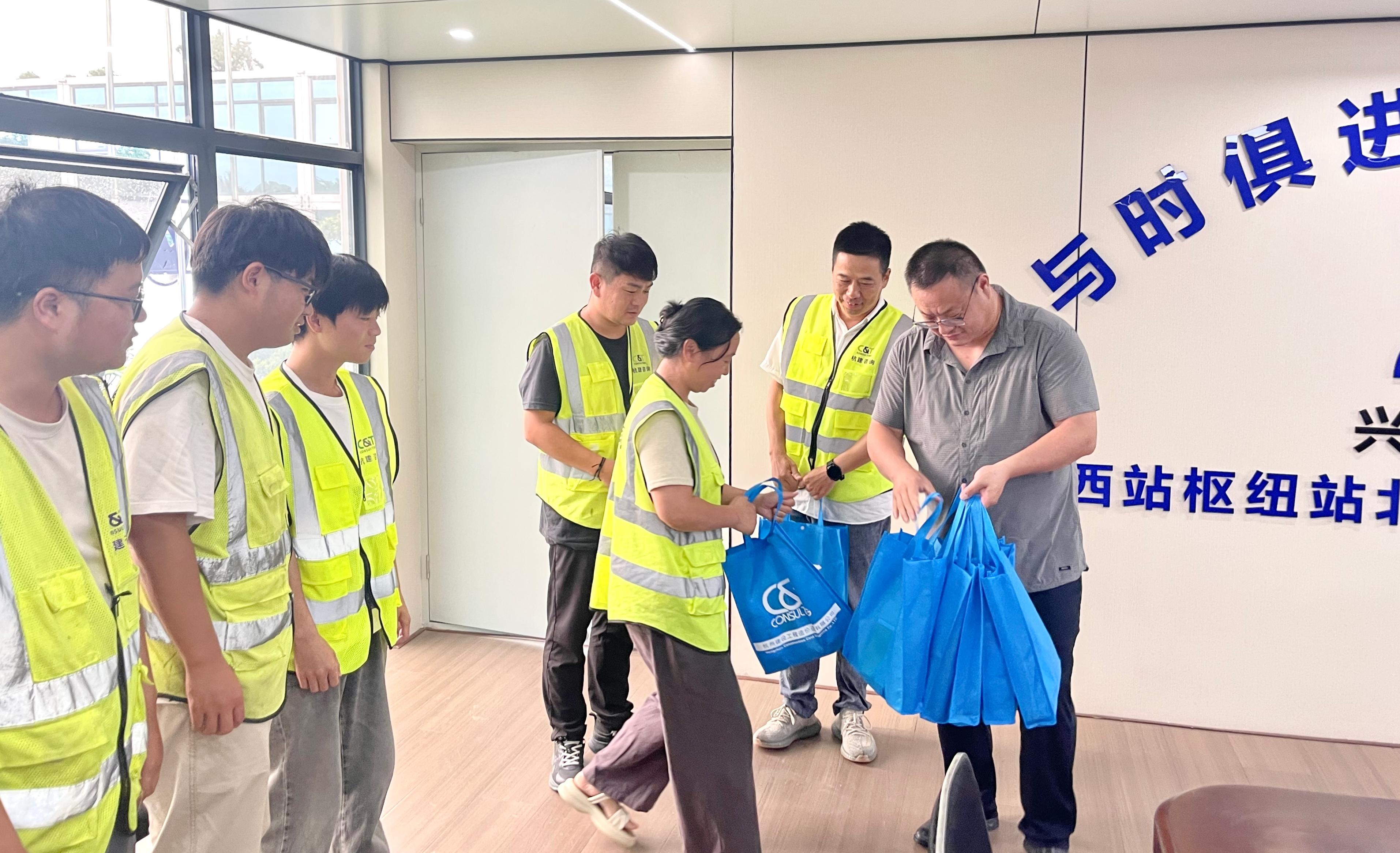 随后,一箱箱饮料、解暑药品和防晒用品被分发到每个人手中,简单的物品承载着沉甸甸的关怀,都是高温作业的“实用装备”。