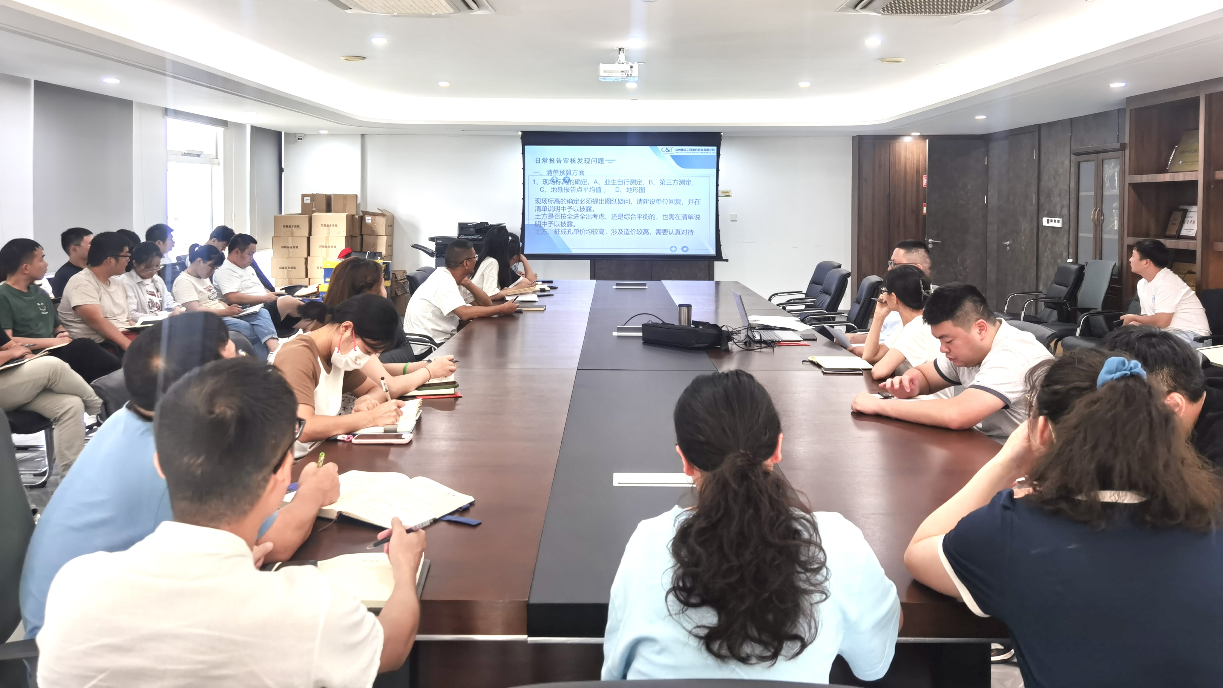 9月4日下午杏彩平台造价事业部在公司四楼大会议室召开全体造价人员大会,本次会议主要议题:一、省造价协会造价鉴定案列入选表彰、杭州市第七届“圆梦人生”工程造价技能大赛表彰;二、造价业务技能培训。