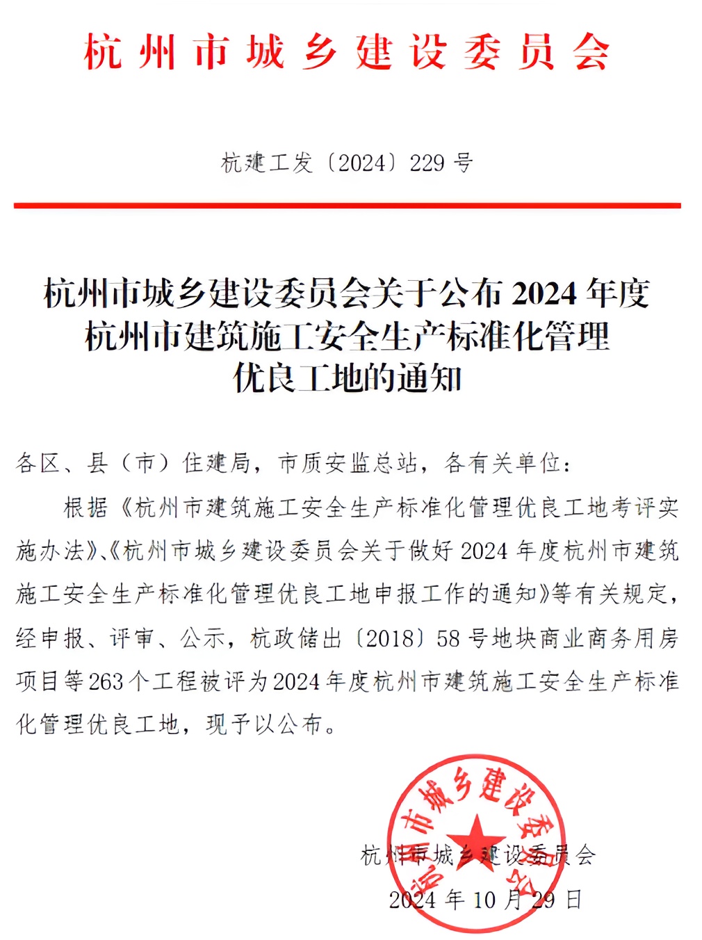 近日,杭州市城乡建设委员会发布《杭州市城乡建设委员会关于公布2024年度杭州市建筑施工安全生产标准化管理优良工地的通知》,我公司参与监理的六个项目成功获评。