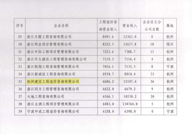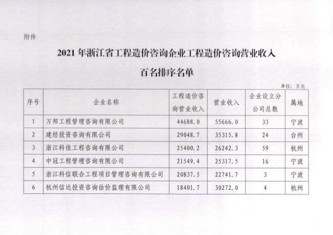 2021年浙江省工程造价咨询企业工程造价咨询营业收入百名