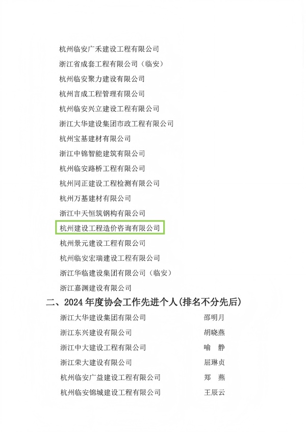 杭州市临安区建筑行业协会2024年度协会先进会员单位